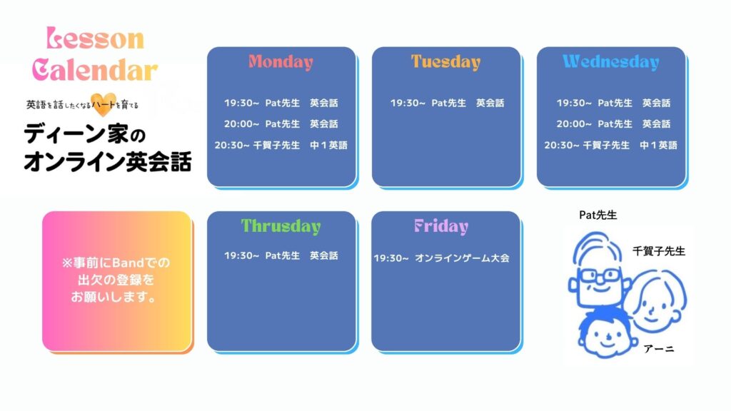 ★月~金まで毎日19:30~19:50/月水は20:00~、20:30~(中学生レベル)